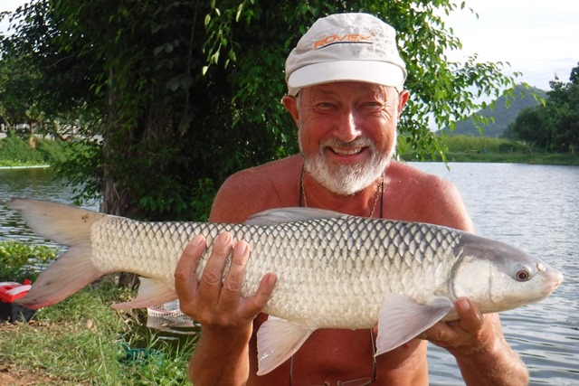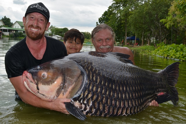 | Pattaya resident Peter Butler made the journey down for another session and it wasn't long before he joined the list of Palm Tree Lagoon 150lb+ BIG Carp Club members with an awesome 170lb+ Siamese. In addition he had some fantastic other catches that included rarely caught small scale mud carp and catla carp, as well as Chinese bighead carp, Mekong catfish, rohu, and both Asian and Amazon redtails. |