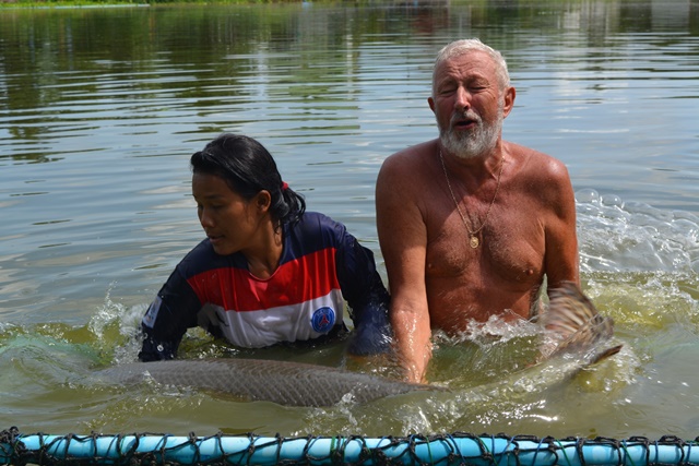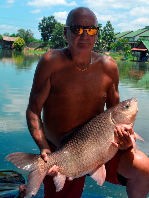 | After a number of attempts Tim finally caught one of the big Siamese out of a nearby lake in Bang Pong after a 90 minute nail biting battle. The more than awesome carp was then purchased and relocated to Palm Tree Lagoon. |